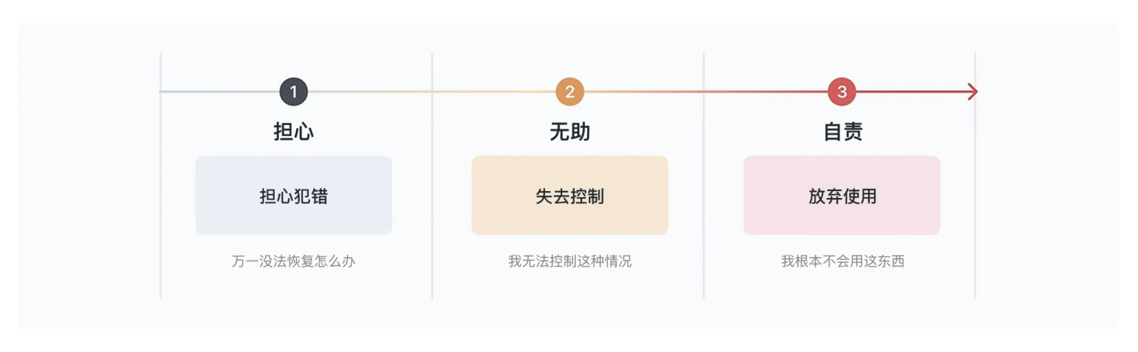 而不管是哪種錯誤,都會觸發(fā)用戶的負面情緒:擔心 “刪錯的文件找不回來”(恐懼)、覺得 “我怎么連這個都不會用”(自責)、面對錯誤提示不知道下一步該做(無助)。最可怕的是 “自責”—— 當用戶把錯誤歸咎于自己,壓力會越來越大,最后干脆關掉 APP,再也不回來。