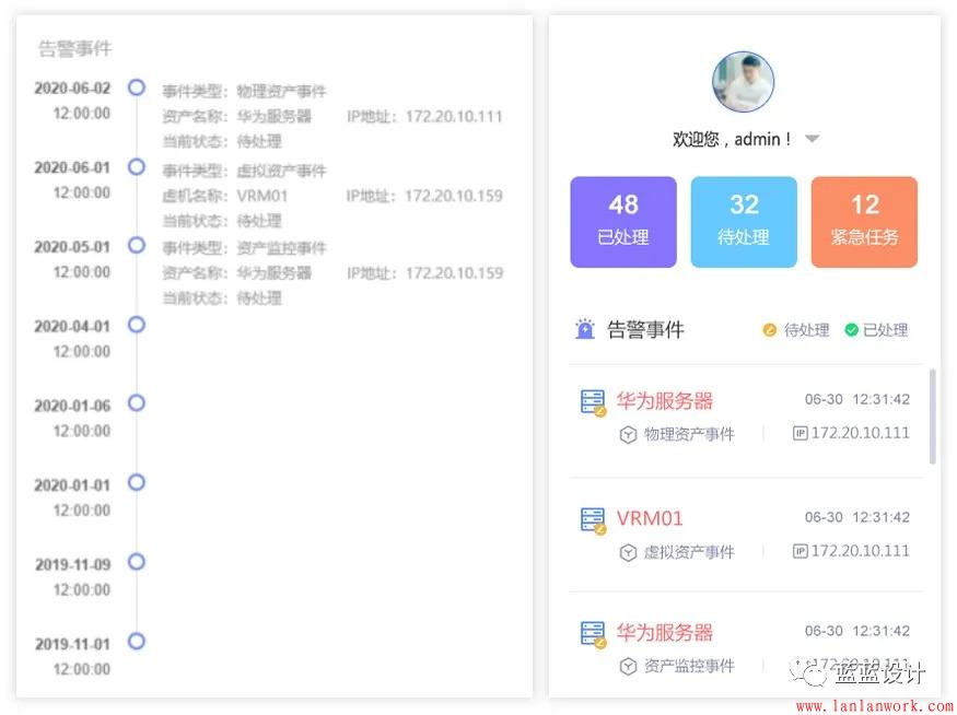 1. 理解用戶所需,優化交互,增加部分內容。告警事件除了原型中的時間線按順序發生外,加了用戶頭像,已處理、待處理、緊急任務統計數字,讓用戶可以總覽全局,做到對工作量心中有數。